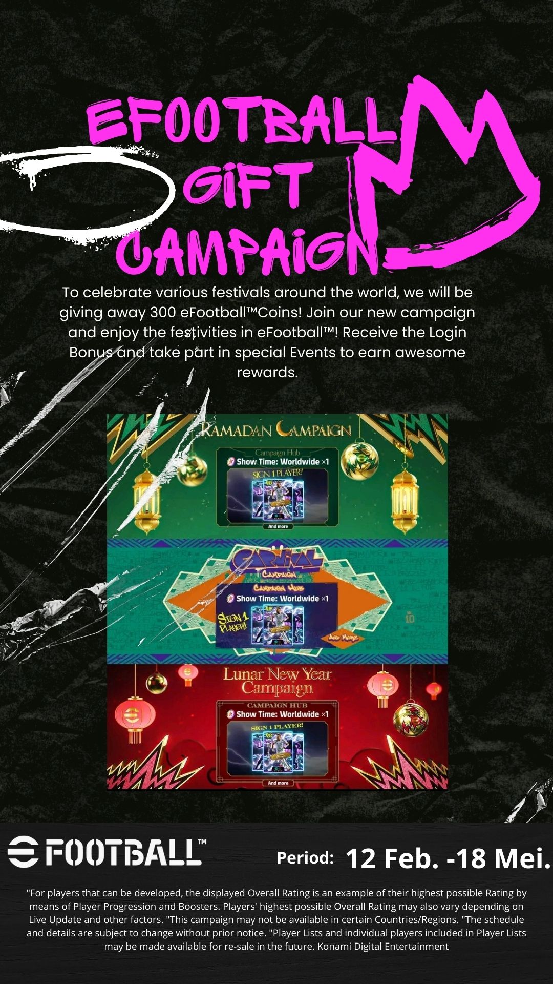 To celebrate various festivals around the world, we will be giving away 300 eFootball™Coins! Join our new campaign and enjoy the festivities in eFootball™! Receive the Login Bonus and take part in special Events to earn awesome rewards.